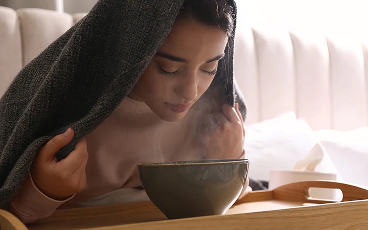 3. Xông hơi: Đặt tô nước sôi lên một bàn và ngồi cách xa tô nước khoảng 20-30 cm. Đậy mặt bằng một khăn hoặc khung bằng giấy dày để hơi không thoát ra. Cẩn thận để không chạm vào tô nước sôi và đảm bảo không gặp nguy hiểm khi làm việc với nước nóng.