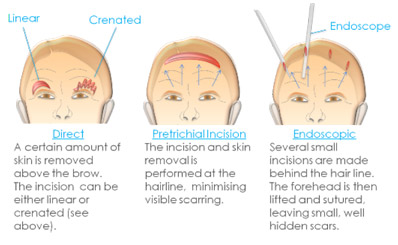 Hiện nay, phương pháp phổ biến nhất là nâng trán nội soi mặc dù tuổi thọ của nó còn hạn chế. Nâng chân mày trực tiếp đặc biệt hữu ích ở những bệnh nhân bị liệt mặt và những người có xu hướng chấp nhận sẹo (giới tính nam, đường trán cao).
