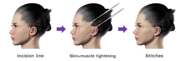 Một đường rạch nâng cơ mặt truyền thống bắt đầu từ thái dương của bạn ở chân tóc, tiếp tục đi xuống và xung quanh phía trước tai của bạn và kết thúc sau tai của bạn ở da đầu dưới. Một vết rạch có thể được thực hiện dưới cằm của bạn để cải thiện hình dạng của cổ.
