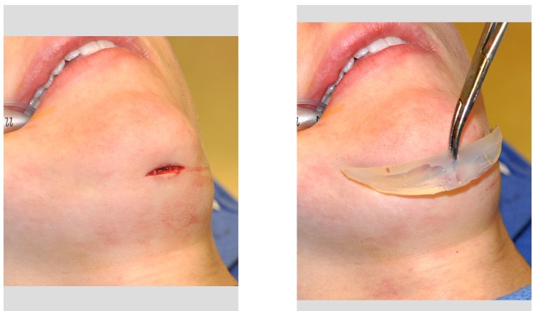 Vết rạch thường được đặt ở nướu dưới của môi và do đó được giấu bên trong miệng. Vết mổ này sẽ lành trong 5 - 7 ngày. Một số bác sĩ chọn vết rạch bên dưới cằm, nhưng vết rạch này cũng sẽ được che giấu một cách tinh tế, với mắt thường bạn sẽ khó nhìn thấy.