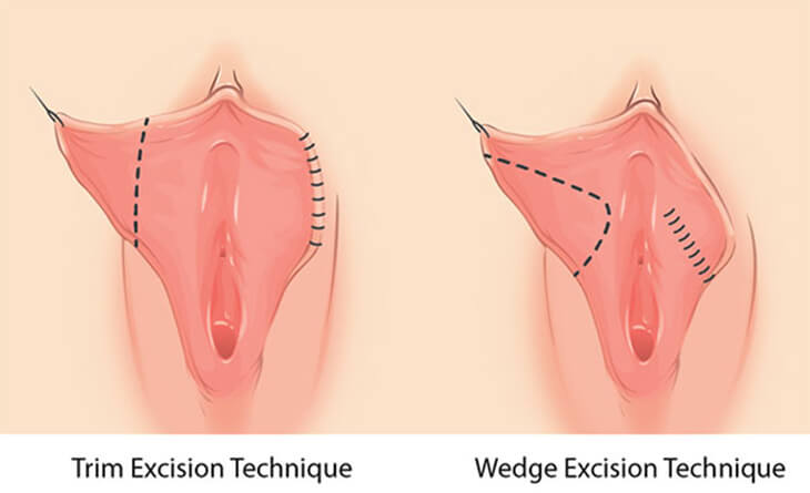 Các mô thừa được đánh dấu theo giải phẫu của từng cá nhân. Có rất nhiều biến thể về hình dạng và mức độ của các nếp gấp. Ở một số bệnh nhân, việc cắt bỏ được thực hiện như một phần mở rộng hình chữ "Y" ra khỏi môi âm hộ. Đóng cửa thường được thực hiện với chỉ khâu có thể hấp thụ.