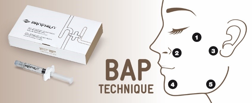 Kỹ thuật BAP còn được gọi là kỹ thuật Điểm thẩm mỹ sinh học - Bio Aesthetic Points. Kỹ thuật Profhilo BAP được áp dụng trên khắp các vùng xương hàm và dưới xương hàm của khuôn mặt. Nói một cách đơn giản hơn, những mũi tiêm này được trải đều trên khắp mặt, với 5 mũi tiêm cho mỗi bên mặt. Tổng công là 10 mũi tiêm cho cả khuôn mặt. Kỹ thuật Profhilo BAP tối đa hóa sự thoải mái và kết quả điều trị với ít ống tiêm hơn.