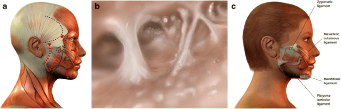 a) Cấu trúc tĩnh và động của lớp mô mềm bao phủ khuôn mặt, cơ, cân và dây chằng giữ.