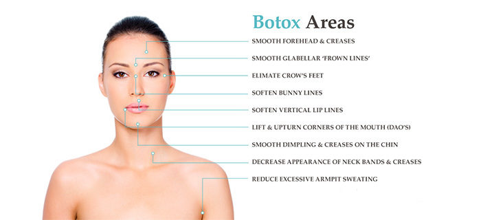 Botox có thể làm giảm nếp nhăn trán, nếp nhăn chau mày, xóa vết chân chim, nếp nhăn rãnh mũi -má và điều trị co giật mi mắt