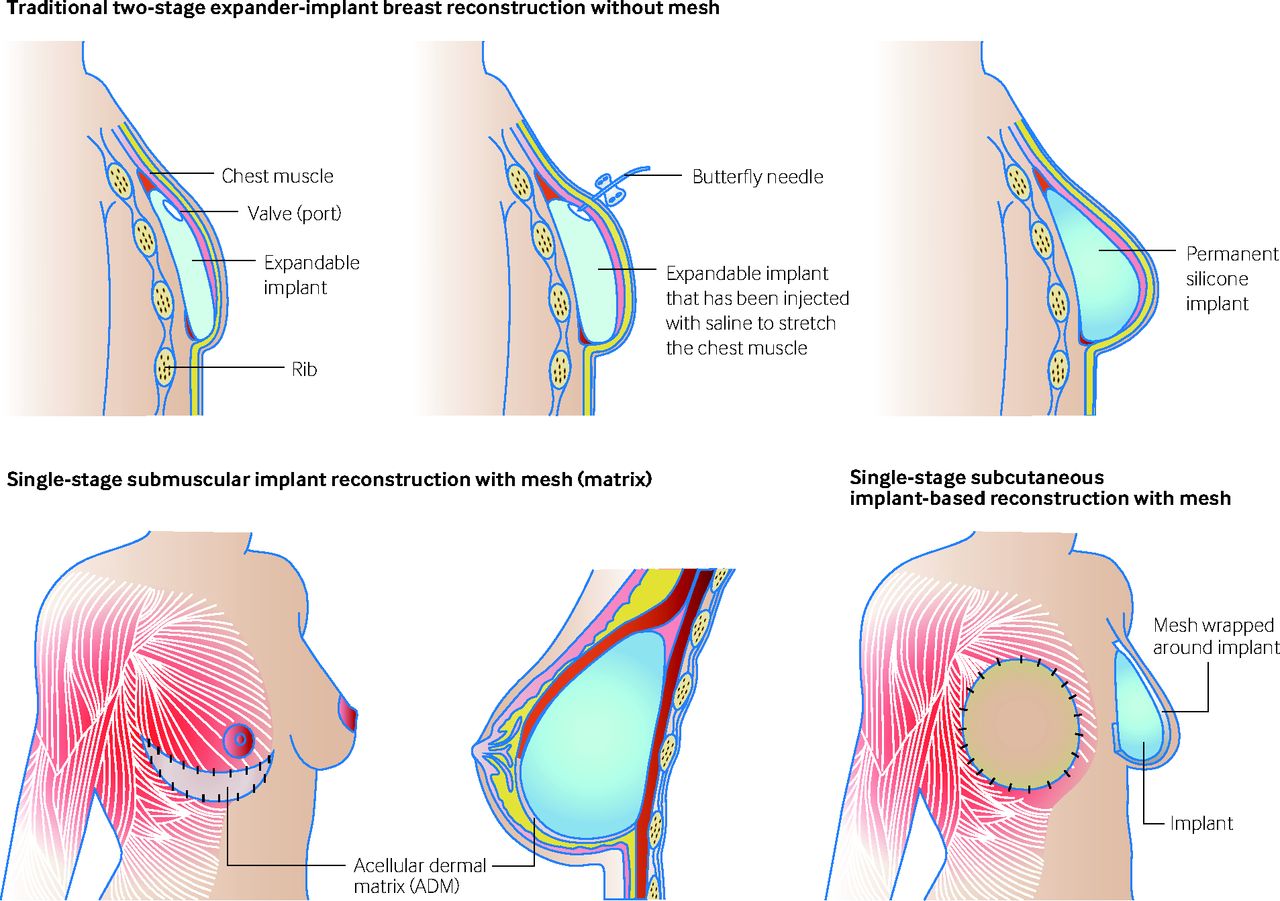 Đối với hầu hết mọi người, đây là một thủ tục hai giai đoạn. Trong giai đoạn đầu tiên, bác sĩ phẫu thuật sẽ đặt một mô giãn nở bên dưới da vú còn lại, hoặc cơ ngực. Thiết bị giãn nở đóng vai trò cấy ghép nước muối tạm thời kéo dài dần các mô còn lại.