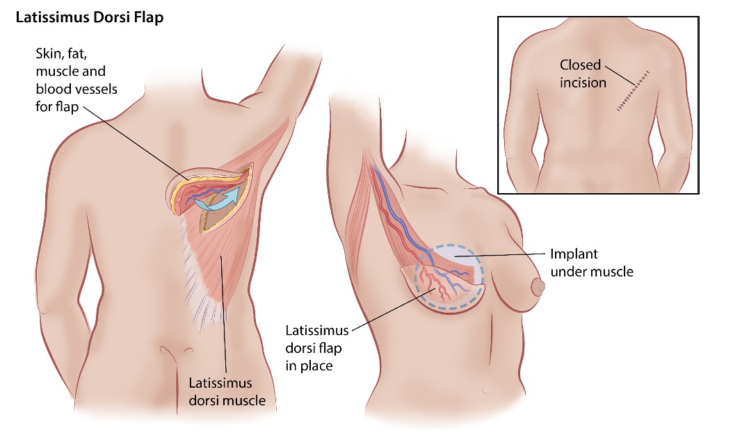 Bác sĩ phẫu thuật thường sử dụng mô từ bụng hoặc lưng để phẫu thuật ghép vạt cuống sống, trong hình là phương pháp tái tạo vú bằng vạt da cơ lưng rộng (LD flap)