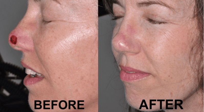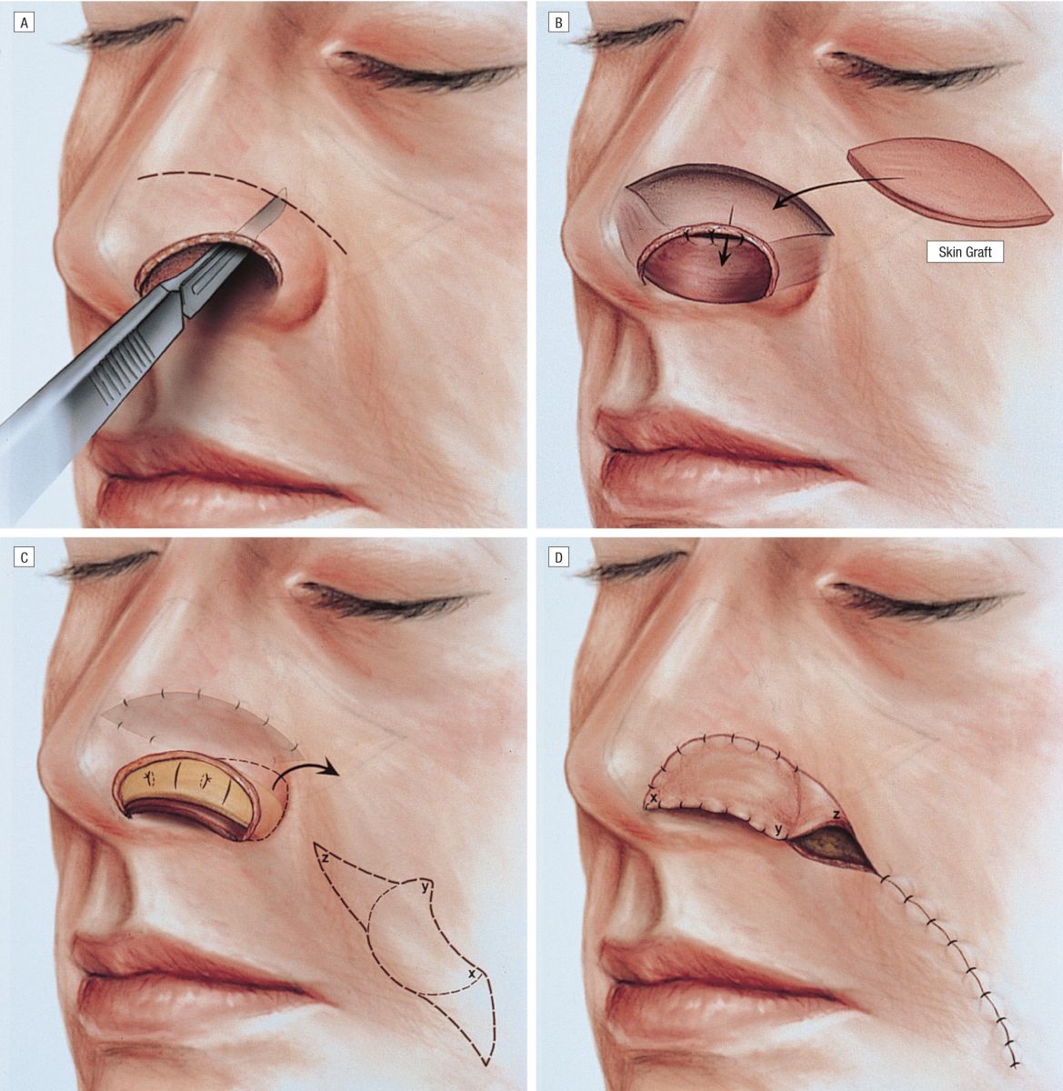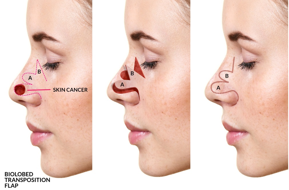 Kỹ thuật ghép da thường được sử dụng để sửa chữa những khiếm khuyết lớn hơn. Da được lấy từ các vị trí hiến tặng trên cơ thể bệnh nhân. Thông thường, bác sĩ phẫu thuật thu hoạch da từ những vùng cơ thể mà bình thường không thể nhìn thấy, chẳng hạn như sau tai. Nếu cần nhiều da hơn, nó có thể được lấy từ đùi hoặc bẹn của bệnh nhân. Mọi nỗ lực đều được thực hiện để mang lại một kết quả hài lòng về mặt thẩm mỹ. Bác sĩ sẽ tạo các vạt da sao cho có thể thay thế mô mũi bằng mô có kết cấu, màu sắc và khả năng hiển thị lỗ chân lông tương đương với da mũi hiện có.