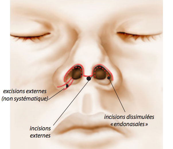 Trong kỹ thuật mở, đường rạch được thực hiện ở bên ngoài cánh mũi, để sau đó có phạm vi hình dung rộng hơn, vì vậy phương pháp này thuận lợi khi cấu trúc bên trong mũi đã bị sụp.