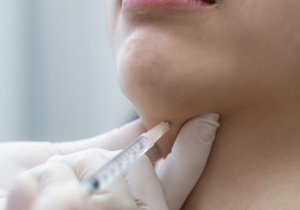 Sau khi đã gây tê cục bộ, một lượng thuốc chính xác sẽ được tiêm theo hình lưới đã được đánh dấu sẵn lên vùng da dưới cằm. Thuốc được tiêm như một phương pháp điều trị duy nhất.